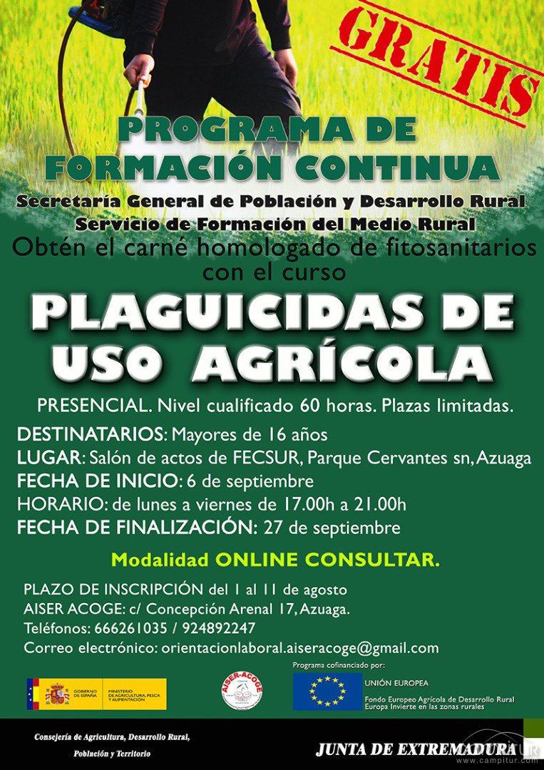 El próximo día 6 de septiembre la asociación AISER-ACOGE organiza de forma presencial y gratuita el curso de Plaguicidas de Uso Agrícola de nivel Cualificado de 60 horas en Azuaga. A través del curso se obtendrá el carnet de fitosanitarios de nivel cualificado, homologado por la Junta de Extremadura.