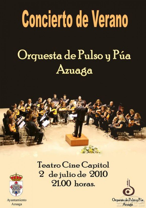 El próximo viernes, 2 de julio, la Orquesta de Pulso y Púa de Azuaga, ofrecerá un Concierto de Verano, coincidiendo con la finalización del curso 2009/2010. En este concierto, que se realizará en el Teatro Cine Capitol de Azuaga, a las 21.00 horas se interpretarán variados temas como "Moon River" de Henry Mancini, "Something Stupid" de Frank Sinatra, "Wonderful world" de Louis Armstrong, entre otros, y que esperamos sean del agrado del público en general.